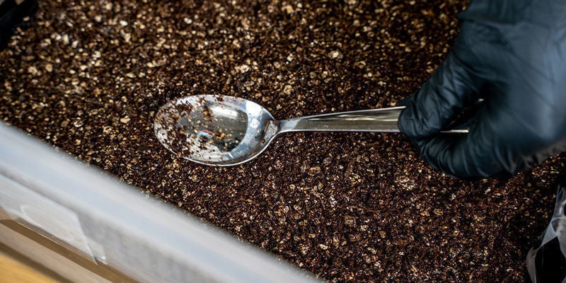 - Ajoutez ensuite de l’eau jusqu’à ce que la couche de gobetage atteigne le niveau d’humidité adéquat. Vous pouvez vérifier en prenant une poignée du mélange et en la pressant. La couche de gobetage est trop sèche si aucune eau ne sort lorsque l’on appuie dessus. Inversement, si vous pressez légèrement votre mélange et que de l’eau s’écoule, il est trop humide. En fin de compte, ce que vous devez arriver à faire, c’est que seules quelques gouttes d’eau sortent lorsque vous pressez le mélange aussi fort que possible.